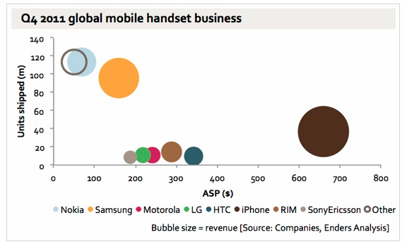 虽然iPhone的发货量尚赶不上诺基亚和三星,但其平均售价和营收却是遥遥领先。Enders Analysis的分析师Ben Evans绘制了下面这张有趣的图表,竖轴代表发货量(百万台),横轴是每台设备的平均售价(美元),圆的大小代表各硬件厂商的营收。单看诺基亚、三星和苹果3家,可以发现出货量越多平均售价越低,营收额也越小。