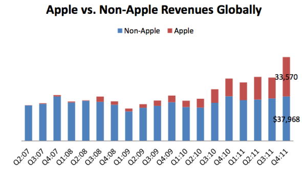 美国券商Morgan Keegan分析师Tavis McCourt发布报告称,苹果2011年第四季度占据整个产业营收的近50%,并囊括了利润的80%。