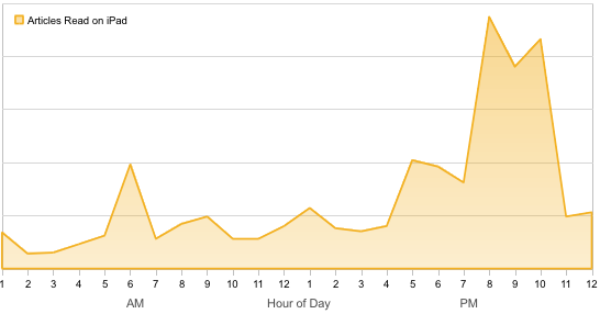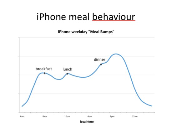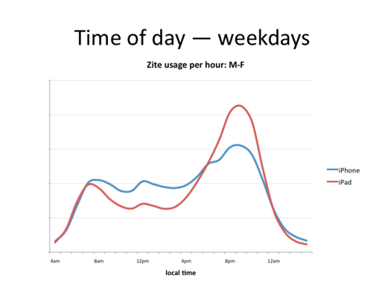 Zite的技术总监麦克克拉斯(Mike Klaas)称:“调查结果有些出人意料,在一天之中的某些时段比如早上、午餐时间和晚餐时间等,用户使用iPhone和iPad的频率都明显增加,用户在一天中的不同时段使用移动设备的情况也是明显不同的。”