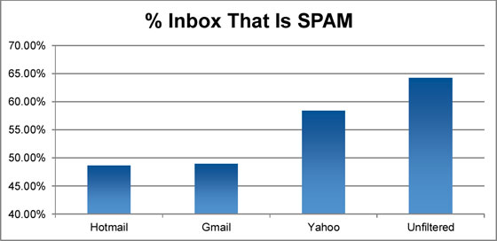 Cascade Insights通过将电子邮件地址放置在各种互联网站和博客上的方式进行调查,结果显示Hotmail的垃圾邮件接受率是48.57%,GMail48.88%,而雅虎则以58.33%的比例排在第三。