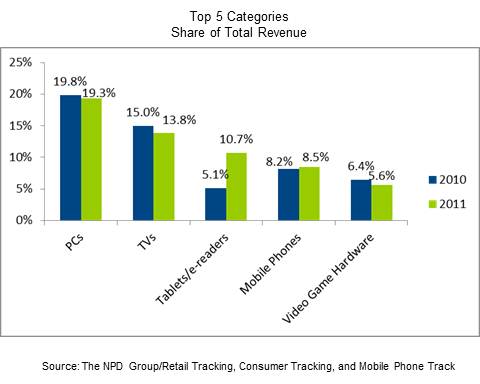 2011年,将近60%的销售归于五大类:电脑、电视、平板和电子书阅读器、手机、视频游戏硬件。其中PC(包括台式机和笔记本)营收280亿美元,占销售的20%,同比下降了3%。平板和阅读器2011年营收150亿美元。