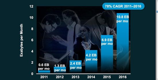 思科预计,移动数据流量将在今年增长110%,预计到2016年时将增长到目前的18倍,达到每月10.8EB。 那个流量水平相当于每年传输330亿张DVD的数据量。