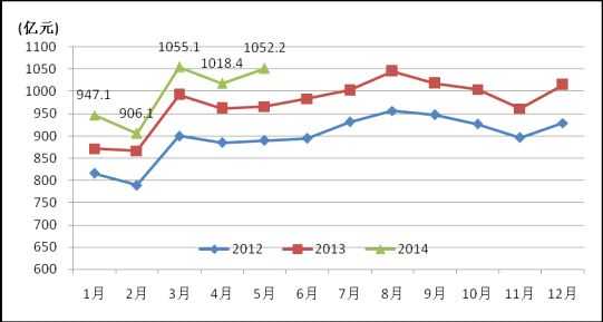 图5. 2013-2014年移动本地和长途去话MOU值各月比较