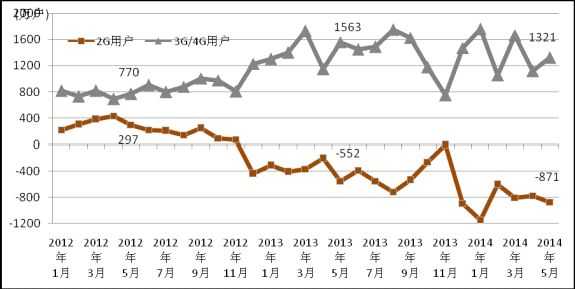图2. 2012-2014年2G用户和3G/4G用户当月净增比较