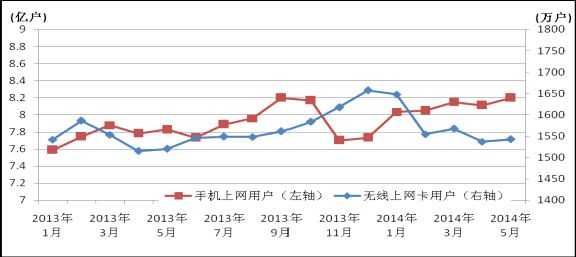 六成以上移动电话用户使用手机上网,无线上网卡用户规模稳在1500万。5月,移动互联网用户总数达到8.57亿户,同比增长5.4%。其中,使用手机上网的用户总数达到8.2亿户,对移动电话用户的渗透率达到65.3%。3G用户上网规模突破3.5亿,对移动宽带用户的渗透率达到74.5%。尽管无线上网卡用户今年以来累计减少114.2万户,但得益于3G网络覆盖日益完善、平板电脑加速普及、上网资费包年使用等,用户规模稳定1500万户以上,同比增长1.5%。