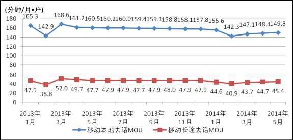 移动本地话音业务增速回落明显,移动本地和长途去话MOU持续下降。1-5月,全国移动电话去话通话时长12135.2亿分钟,同比增长2.3%,比1-4月回落0.1个百分点,比上年同期下降3.6个百分点。其中,移动本地和移动长途分别为9313.8、2821.4亿分钟,同比增长1.9%和3.8%,分别比上年同期增速低3.9、2.2个百分点。每用户每月贡献的移动语音业务量同比持续下降,移动本地去话MOU为149.8分钟/月·户,移动长途去话MOU为45.4分钟/月·户,分别同比下降6.7%、4.9%。