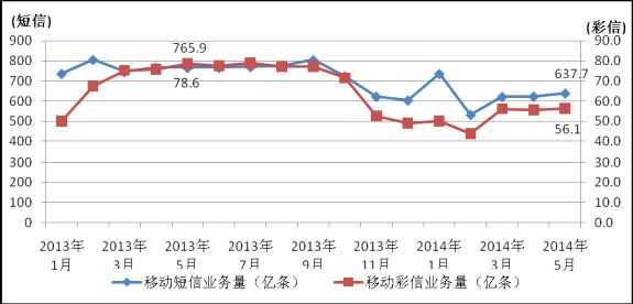 图6. 2013-2014年移动短信业务量和彩信业务量各月比较