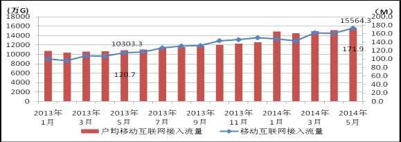 移动互联网接入流量日均470万G,月户均移动互联网接入流量超170M。今年以来4G终端促销力度不断加强,流量资费不断降低,用户使用手机上网的时间不断变长,推动移动互联网流量保持高速增长。1-5月,移动互联网接入流量7.01亿G,同比增长52%,比2011全年移动互联网接入流量多三分之一,平均每天产生移动互联网接入流量468万G。月户均移动互联网接入流量达到171.9M,同比增长44.7%。其中,通过手机上网的流量达5.9亿G,同比增长94.2%,占移动互联网接入流量的83.5%。月户均手机上网流量达到149.9M,同比增长86.2%。全国固定互联网宽带接入时长16.1万亿分钟,同比增长29.8%。