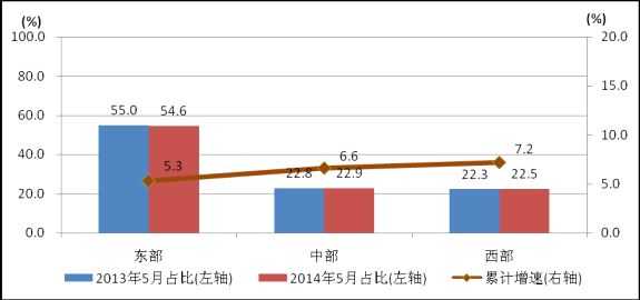 图9. 2014年5月东、中、西部电信主营业务收入同期比较