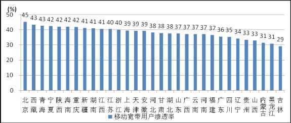 5月,东、中、西部地区移动宽带用户分别比上年末净增3338.3、1826.8、1894.7万户,东部地区净增用户占比达47.3%。东中西部地区移动宽带用户普及情况差异不大,东部地区移动宽带用户渗透率最高,达38.2%,分别比中西部地区高1.5、0.7个百分点。各省之间移动宽带用户渗透率差异较小,渗透率高于40%的省份超过三分之一,其中北京全国最高,达到45.2%,吉林渗透率不足30%,仅为29.2%。