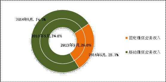 非话业务收入保持快速增长,互联网及数据业务收入占比超三分之一。各基础电信企业“去电信化”经营策略加速实施,通过创新流量经营、加快融合业务推广等方法,互联网及数据业务等非话业务在电信业务收入中的比重不断增大。1-5月,非话音业务实现收入2829.6亿元,同比增长14.3%,在电信业务收入中的占比由上年同期的53.1%提升到56.8%。固定和移动数据及互联网业务收入分别实现652.8、1025亿元,同比增长6.3、47%,占电信业务收入的比重分别达到13.1%、20.6%。话音业务收入继续下滑,同比下降1.5%,但下滑趋势趋缓,降幅比1-4月收窄0.5个百分点。