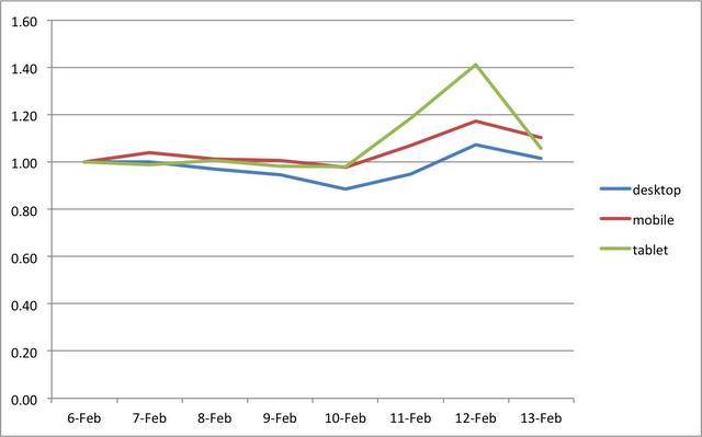 而对于没有情人的单身族们来说,平板设备或许是您最好的伴侣。通过分析我们发现,情人节之前的一周,对交友网站的大量搜索中,来自平板设备搜索请求的增幅远远大于台式电脑或者智能手机。寻求一夜情的单身人士们,最终结果似乎并未如愿,不得不与平板设备一起过情人节了。