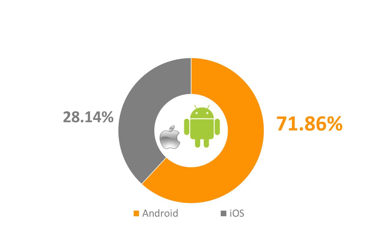 Android市场份额较大占71.9%, iOS占据28.1%的市场份额;Android市场份额依然占优势,发展非常迅猛。