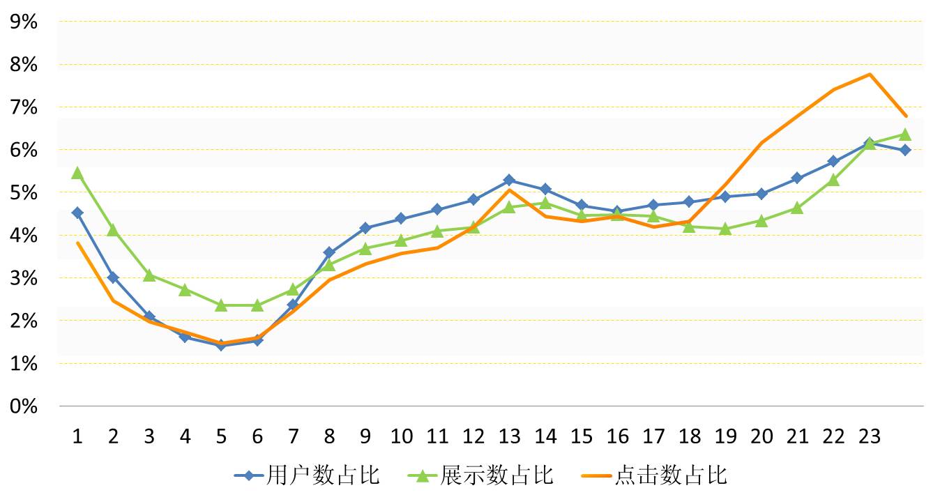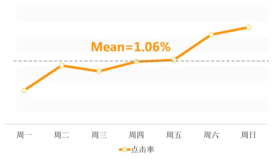 对于行业外的CPC广告而言,点击率在周四达到平均水平的1.06%,并且在周六和周日达到峰值。手机用户在周末的消费需求或欲望更强烈,CPC广告凭借此冲击力往往会获得不错的回报率。