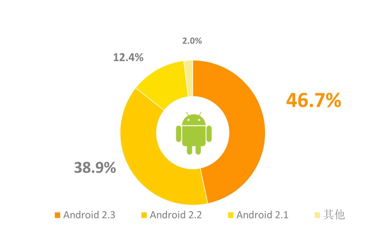 Android2.1、2.2、2.3为主流版本,占据98.0%份额;其他版本的总和仅占2.0%。
