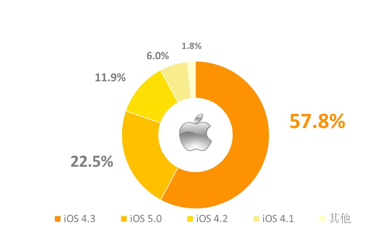 iOS 4.x版本仍是主流,占了75.7%的份额,随着iPhone4S的热销,iOS 5.x版本有望分享iOS 4.x的份额。