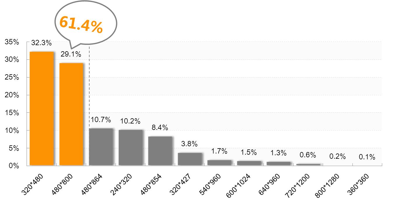 移动广告市场主流终端分辨率为:320*480 和480*800, 市场份额超过50%;240*320等中小屏终端份额小幅下降;大屏终端种类增多,市场份额较少,但有所增长。