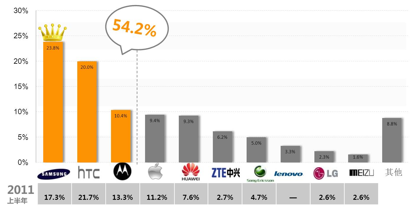 三星、 HTC、摩托罗拉市场占有率较高,共同占据了54.2%的市场份额;三星击败HTC,市场占有率从第二位升到第一位。索尼爱立信、联想市场占有率有所上升。