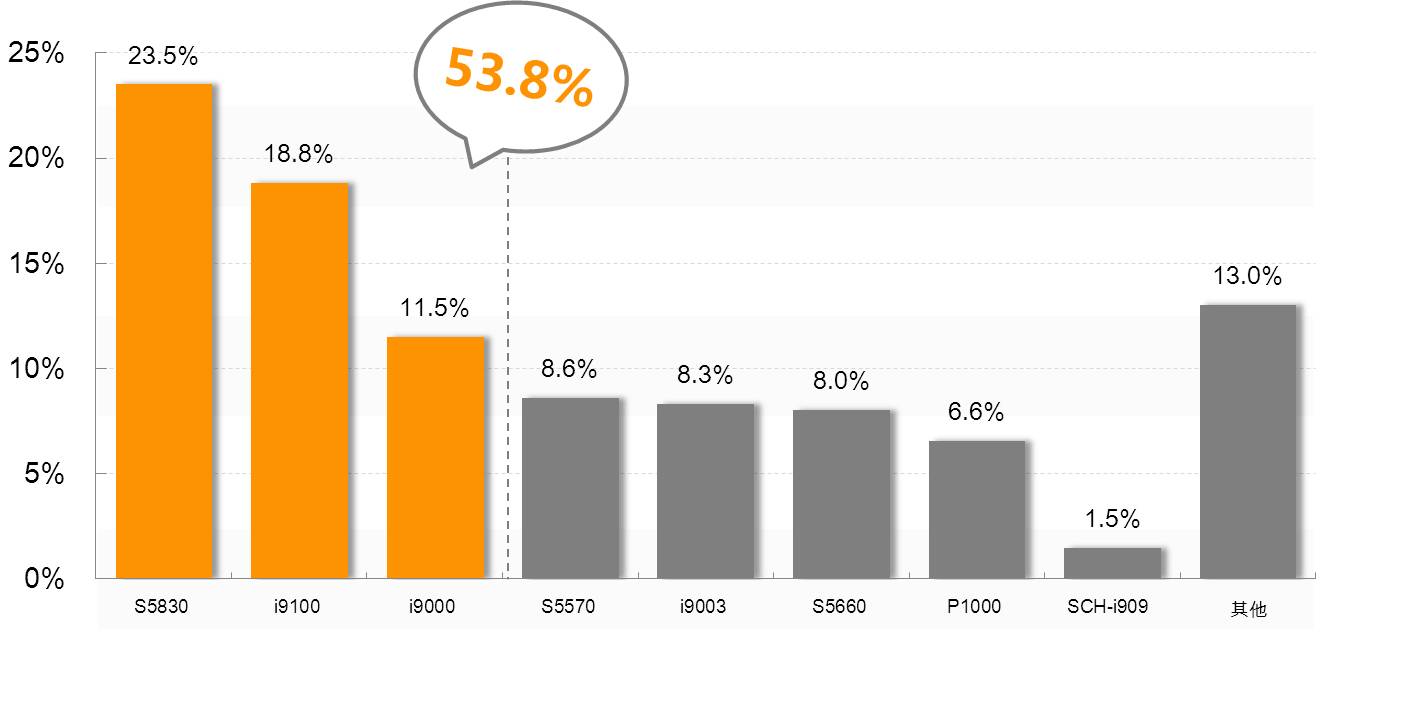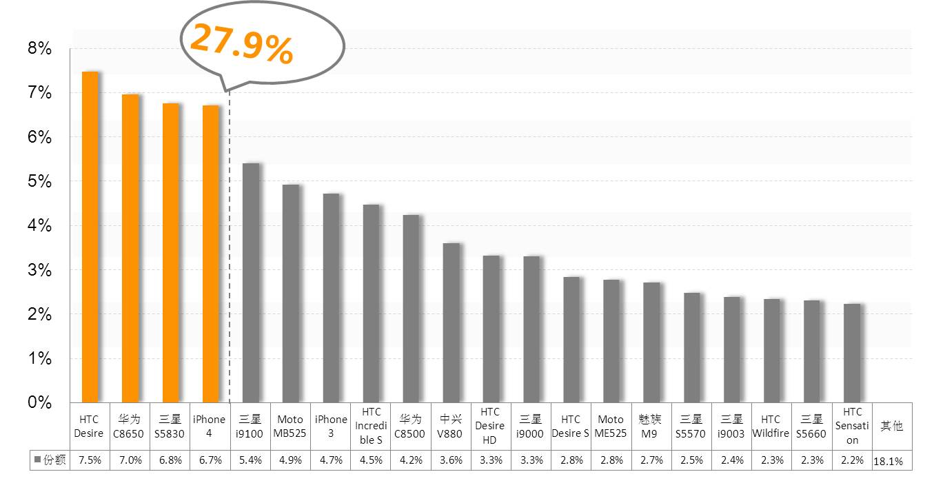 HTC Desire高居单款手机占有率排名榜首,HTC和三星分别有六款机型排名前20;HTC Desire 、华为 C8650 、三星 S5830、苹果iPhone 4占27.9%的市场份额。