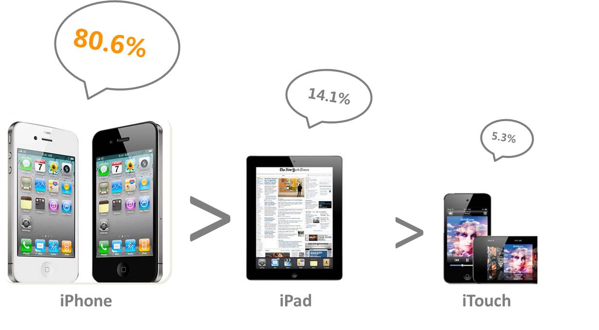 单款手机,iPhone仍高居榜首,在苹果终端中占据80.6%的市场份额;iPad的市场份额大幅上升,从上半年的7.6%升至14.1%;iTouch市场份额持续下降。