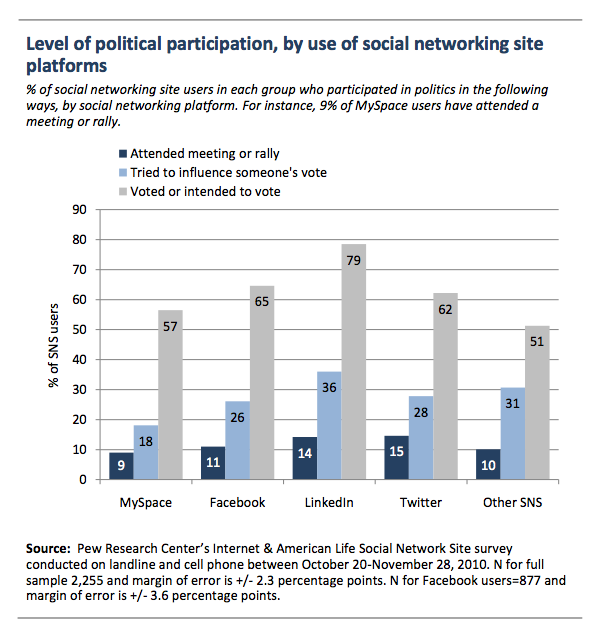 而在政治活动方面,Linkedin用户是最活跃的政治参与群体。79%的lInkedin用户参与过投票或注册去投票,36%的人还试图影响他人的投票。下图是不同社交网站的政治参与情况。Pew还研究了社会化媒体用户对不同声音的开明程度,他们称之为换位思考,他们发现Myspace用户更可能对不同声音持开放态度。