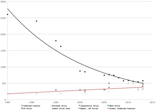 (图注:1985年——2014年以来个人电脑旁、各类游戏主机的价格走势;黑色线代表PC价格走势;红色线代表不同种类游戏主机的综合走势)