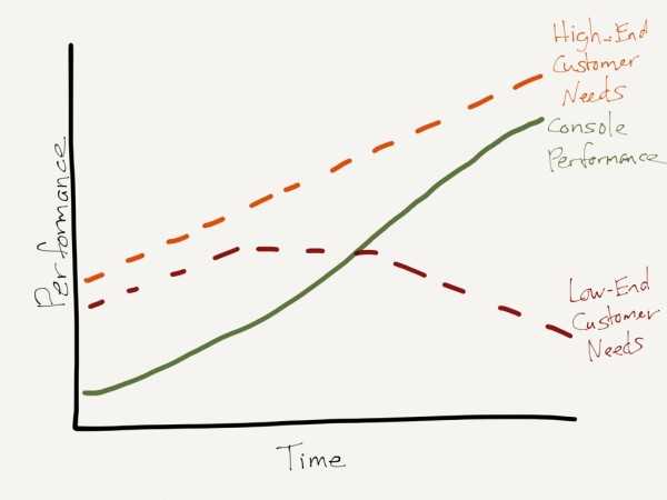 上图可见,高端和低端客户的需求走势已经明显分道扬镳,微软和索尼的产品都走上了追逐高端客户的路,结果可想而知。不过很难想像的是,在游戏机行业,高端客户竟然比主机生产商更有发言权。汤普森认为,最典型的例子莫过于微软的Xbox One。