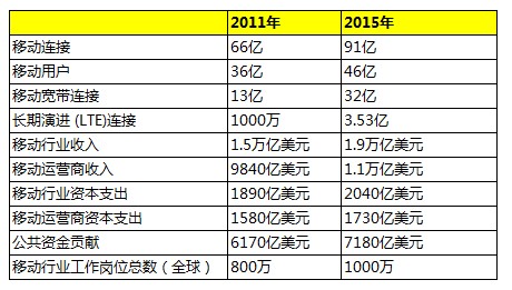 移动行业规模将从2011年的1.5万亿美元增至2015年的1.9万亿美元