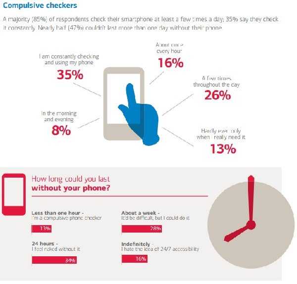 该调查还显示,51%的用户每小时至少查看一次他们的智能手机,35%的用户称他们“不断地”查看自己的手机,这表明了现代人对智能手机有多么地上瘾。