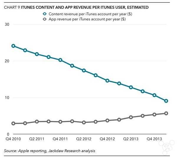另外数据显示用户在应用上的花费和在音乐上的是相同的。2010年第四季度消费者购买内容花费 25 美元,到 2013 年第四季度这个数字减少 10 美元以下。出现这种变化,原因之一可能就是庞大的用户基数。用户越多,特别是在可用内容较少的市场中,每用户的平均额就会越低。