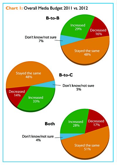 一半的营销者表示2012年的直接营销预算相比2011年没有变化;B2C营销者显然更乐观,1/3的人表示他们的预算会增加,14%的人表示会减少。B2B营销人员中,则有29%会增长,16%会减少,混合型的公司中,则有28%表示会增加。