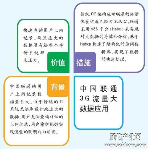而且,这一次,国内三大运营商的步伐并没有被落下。耿向东告诉记者,中国联通已经把大数据作为未来发展的主要战略,IT系统也确定了以“集中大数据为核心,顶层设计引领IT建设,服务下层,助力客户感知”为总体战略。