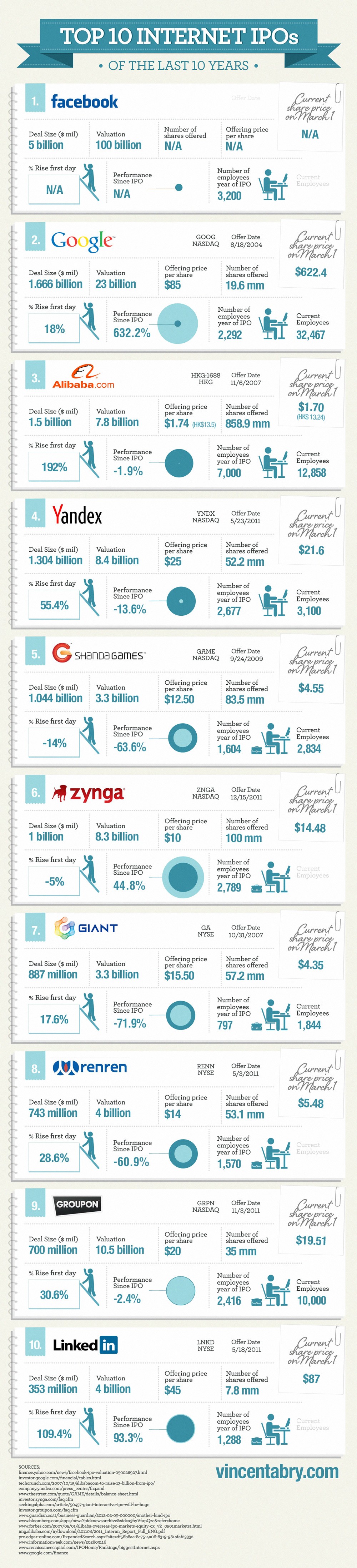 信息视图:互联网十大IPO 互联网企业上市IPO对投资者而言是个好消息,我们暂且把Facebook当作成功上市,回顾互联网史上最大的10次IPO: 1、Facebook 2、Google 3、阿里巴巴 4、yandex 5、shanda 6、zynga 7、Gi^nt 8、人人网 9、Groupon 10、Linkedin 更多阅读:贝壳:2019年营收超460亿 正式递交美股IPO文件十年内十大互联网IPO–数据信息图思科:2022全球网络趋势报告ToolTester:2021年全球网络服务中断统计 游戏服务类Steam掉线最多QuestMobile:2020微信小程序半年报告 疫情催化 百万用户微信小程序破千个 商业价值大战悄然开启声网:2Q20总营收同比增长128% 活跃客户数持续增长埃森哲研究:仅12%中国企业建立了弹性供应链埃森哲联合领先企业发起“连接人与工作”平台 多家知名企业首席人力资源官参与QuestMobile:1Q20移动互联网黑马榜 巨头缠斗企业服务、教育学习等领域2019互联网女皇报告精选银行卡检测中心&信息无障碍研究会:2020年金融App信息无障碍研究TC:多组数据显示Pinterest增速放缓国家统计局:中华人民共和国2019年国民经济和社会发展统计公报AMD:2022年Q3 AMD游戏业务同比增长32% 其游戏业务规模每年50亿美元CDC:美国电子烟相关病例激增至530例 死亡人数增至7人