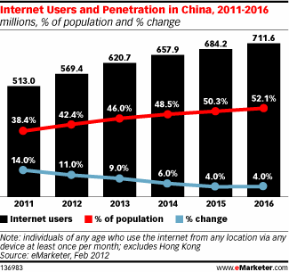 中国互联网用户众,eMarketer预计2011年底将有5.13亿网民,尽管用户数量增长在2013年会回落至1位数,并且要到2015年网民的数量才能占到人口的多数,但中国仍然是世界上网民最多的国家,而且数量变得越来越大。
