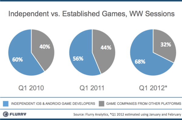 上图,Flurry将游戏进程分成两类,一类是独立游戏开发商,这类开发商一开始就在ios和android上从事游戏开发,而在位游戏厂商则指从其他平台延伸到ios和android平台上来的游戏开发者。2010年,60%的游戏进程属于独立游戏开发商,2011年该数据减少成为56%,这主要是因为在位游戏厂商收购了很多独立游戏开发商,但是2012年,独立游戏厂商又在崛起,占比达到68%。