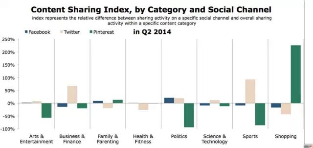 8、在购物内容共享中,Pinterest有高达226%的共享,远高于平均水平,Twitter也少于43%,Facebook则少于17%。
