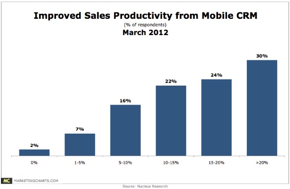 同时来自Nucleus的报告还显示,移动访问CRM的价值甚至超过社交,移动技术提升CRM销售效率达14.6%。有3/10的移动CRM用户称他们的生产效率提升超过20%,46%的人则提升了10-20%,意味着3/4的移动CRM用户销售效率至少提高了10%以上。相比,只有2%的人称没有从移动CRM中获益。