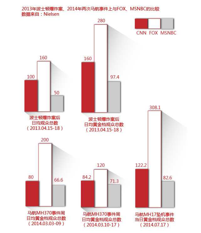 近期的乌克兰坠机事件及以色列地区冲突,使得 CNN 于本周二晚间黄金档在 25-54 岁观众群体中以较大优势击败 MSNBC。晚间 8-11 点,CNN 的每小时观众均数在 21 万,几乎是 MSNBC11.4 万观众的两倍。但是,FOX 的观众均数达到了 40.1 万,又几乎是 CNN 的两倍。我们比较了两起突发事件上三家的表现。