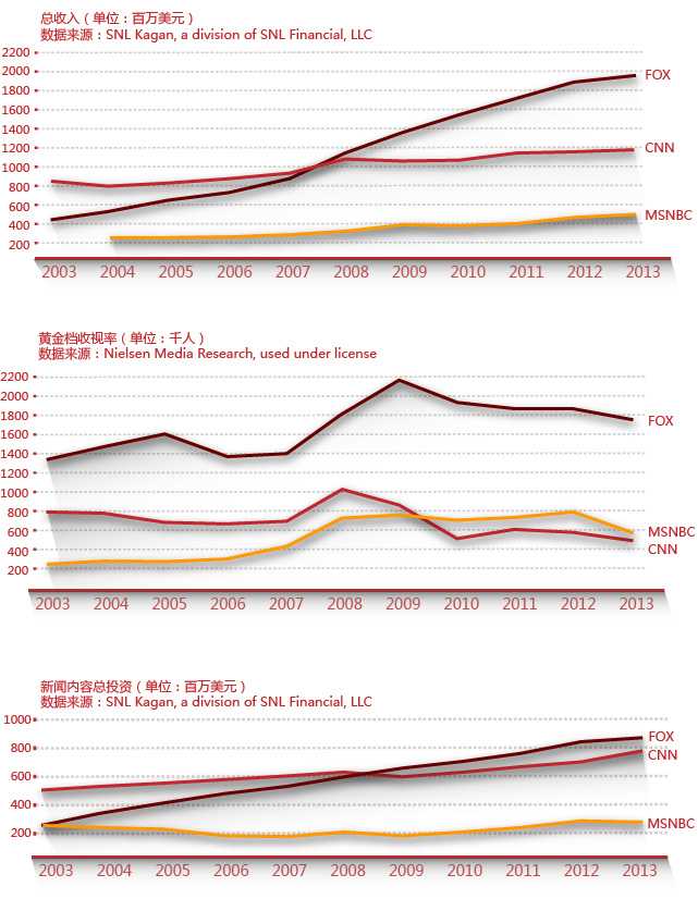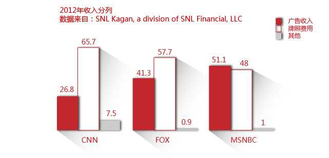 根据尼尔森公司的统计,在过去 50 个季度里,FOX 的观众数都要高过 CNN,在最近的几个季度里,FOX 的观众数达到了 158万,几乎是 CNN 46 万观众数的 3 倍。三家的收入结构大约是这样的: