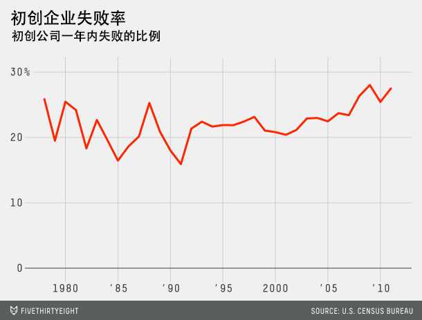 更让人惊讶的也许是这个数字:2011 年的统计表明,27% 的初创企业在成立一年内都失败了。在二十年前,这个数字是 20%。