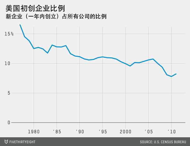 然而初创企业真的有看起来这么多吗?FiveThirtyEight 的一篇文章研究了美国人口普查局公布的数据,得出的结论却是:美国企业正在逐渐迈向老龄化,臃肿化。