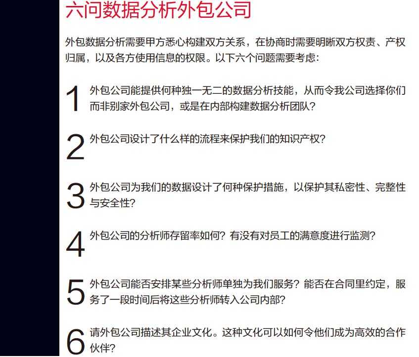 数据分析技能有待提高的两家公司在难以找到具有熟练量化分析技巧的员工的地区设有事业部。他们知道自己在数据分析方面的不足,也知道设立内部数据分析团队的难度:设立这样的团队的成本很高,若投入不足,则失败的风险很大。因此,设立专门的离岸数据分析团队也显得过于冒险。最后,他们请商业流程外包公司为他们的员工进行了数据分析方面的培训。将数据分析外包则被视为实现竞争优势的一种方式。在某些案例中,他们会根据规模、特定的技巧以及领域知识来选择外包公司。一家发包公司的管理者说: