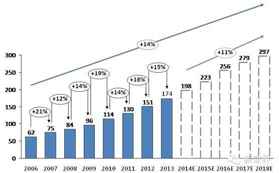 如果包含食品药品、医疗服务、并发症处理、健康管理和日常监测的话,有资料显示,整个糖尿病相关产业每年约为4000多亿美金的容量。据统计,仅2012年全球糖尿病的药品市场规模就达424亿美元,而且每年平均增长率约为8.2%,在全球药品市场中排第四位。而我国糖尿病的药品市场规模同样发展迅速,截止2013年,市场规模达173.77亿元人民币。预计到2018年,我国糖尿病药品市场的规模将接近300亿元,而且增速要大大超过全球平均。