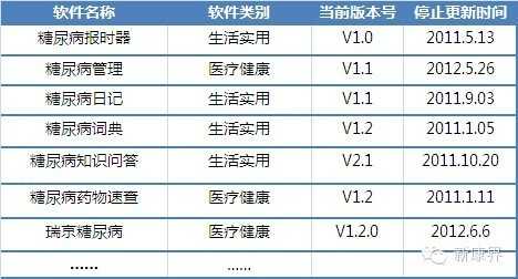 我们姑且不计较这些数据的来源与正确性,但我确实发现,许多创业者因为这些数据的激励,前赴后继地进入移动医疗,当然糖尿病APP也不能幸免。Dr.2测评小组以各大安卓市场的综合搜索汇总为例,进行数据分析(见下表),与糖尿病直接相关的app大约就有500多个,但其中很大一部分于2011-2012年停止了更新,且版本系统普遍停留在v1.0-2.0之间。