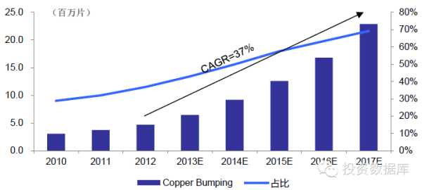 据YoleDeveloppement预计,2017年全球CopperBumping市场规模将达到2300万片/年(12英寸晶圆折算,后同),对应2012年不到500万片/年的市场规模年复合增长率高达38%。这主要受益于Bumping技术本身市场规模年复合20%以上的快速增长,以及Copper Bumping技术对其他材料Bumping技术的逐渐替代,Copper Bumping占比将从2012年的37%提升到2017年的69%。按12英寸Copper Bumping芯片250美元价格估计,届时市场规模将达近60亿美元。