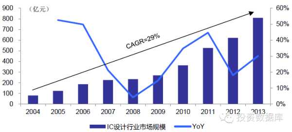在国内集成电路三个环节中,2004 年IC 设计占比最少仅有15%,市场规模只有制造环节的45%。不过经过这十年的高速发展,2013 年IC 设计环节占比已经上升到了32%,市场规模比制造环节高出35%。