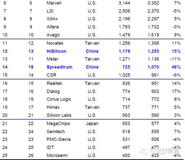 IC 设计领域之所以获得如此高速的增长,主要是得益于在国内巨大需求刺激下涌现出了一批具有国际竞争力的IC 设计公司。据IC insights 统计,2013 年全球前25 大FablessIC 设计公司中,中国厂商华为海思和展讯占据两席。其中华为海思以13.55 亿美元的销售额排在第12 位,展讯以10.7 亿美元的营收排在行业第二位,并以48%的同比增速成为增长最快的公司。现在在竞争异常激烈的Fabless IC 设计领域,这些国内优秀的设计厂商已经初具竞争力,甚至直接对国际大厂直接造成威胁。