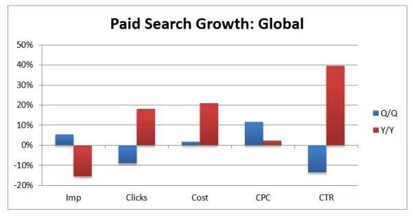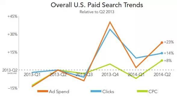 2014年第二季度来自大型搜索营销公司的报告显示,在美国及全球,付费搜索的支出持续增长。报告也强调,移动及图形广告的影响在扩大。