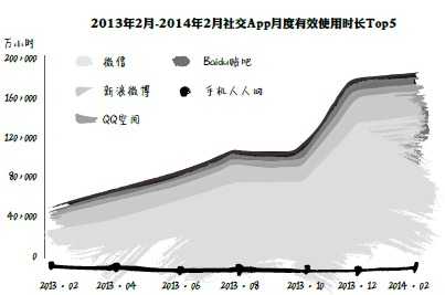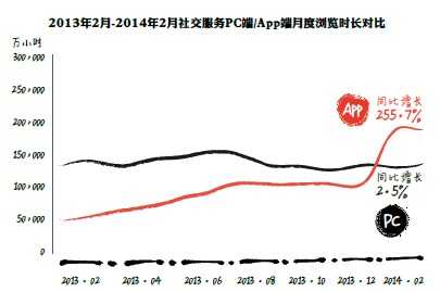 数据显示,PC端社交服务遭遇增长瓶颈,并趋于饱和,社交服务流量向移动端转移趋势明显。艾瑞咨询监测数据显示,2013年2月至2014年2月,社交类服务App月度使用时长同比增长率高达255.7%,但PC端同比增长率仅为2.5%。社交用户在移动端耗时明显超过PC,其中微信和微博更成为移动端耗时增长的主要因素。