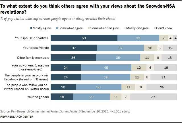 在研究中,调查者被问到“是否愿意讨论斯诺登事件?”,结果显示人们更愿意在现实中跟家人朋友讨论此事,而在 Twitter 和 Facebook 上更倾向于保持沉默。此外,对事件的了解程度和对话题是否感兴趣也是部分影响因素。